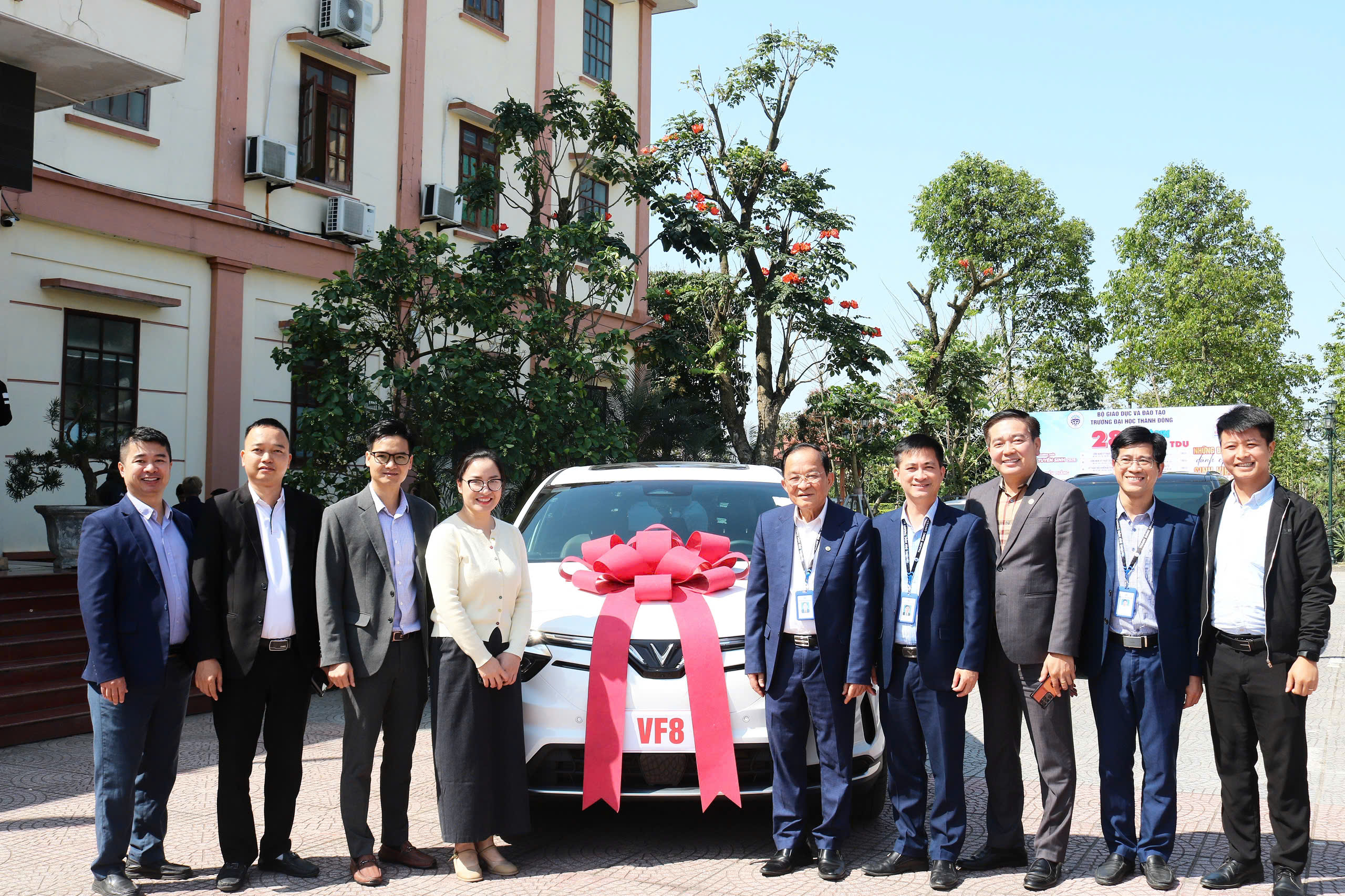 Đại diện VinFast và Ban Giám hiệu Trường Đại học Thành Đông thực hiện nghi thức bàn giao xe điện VinFast VF8 cho Khoa Cơ khí – Ô tô.