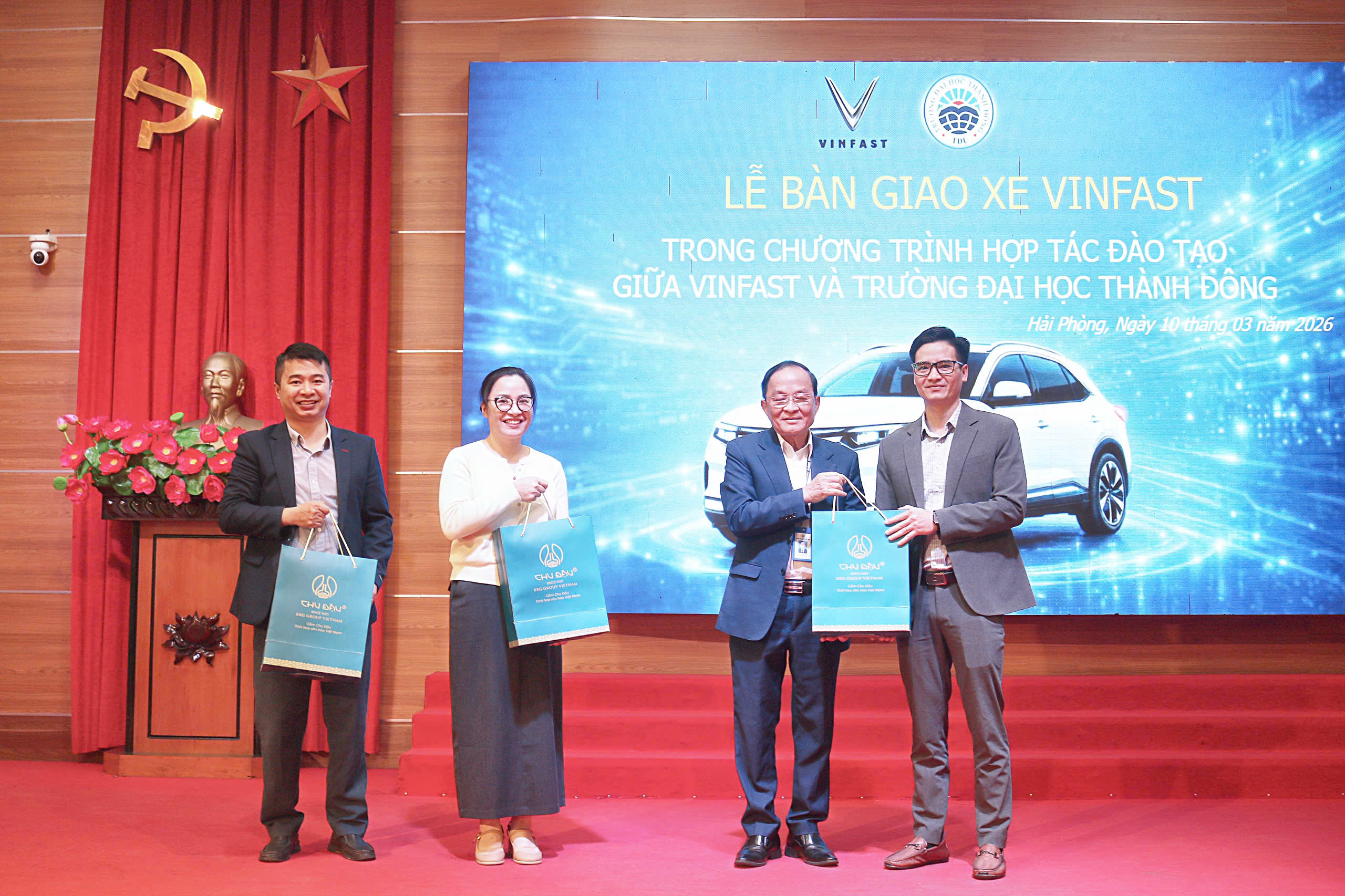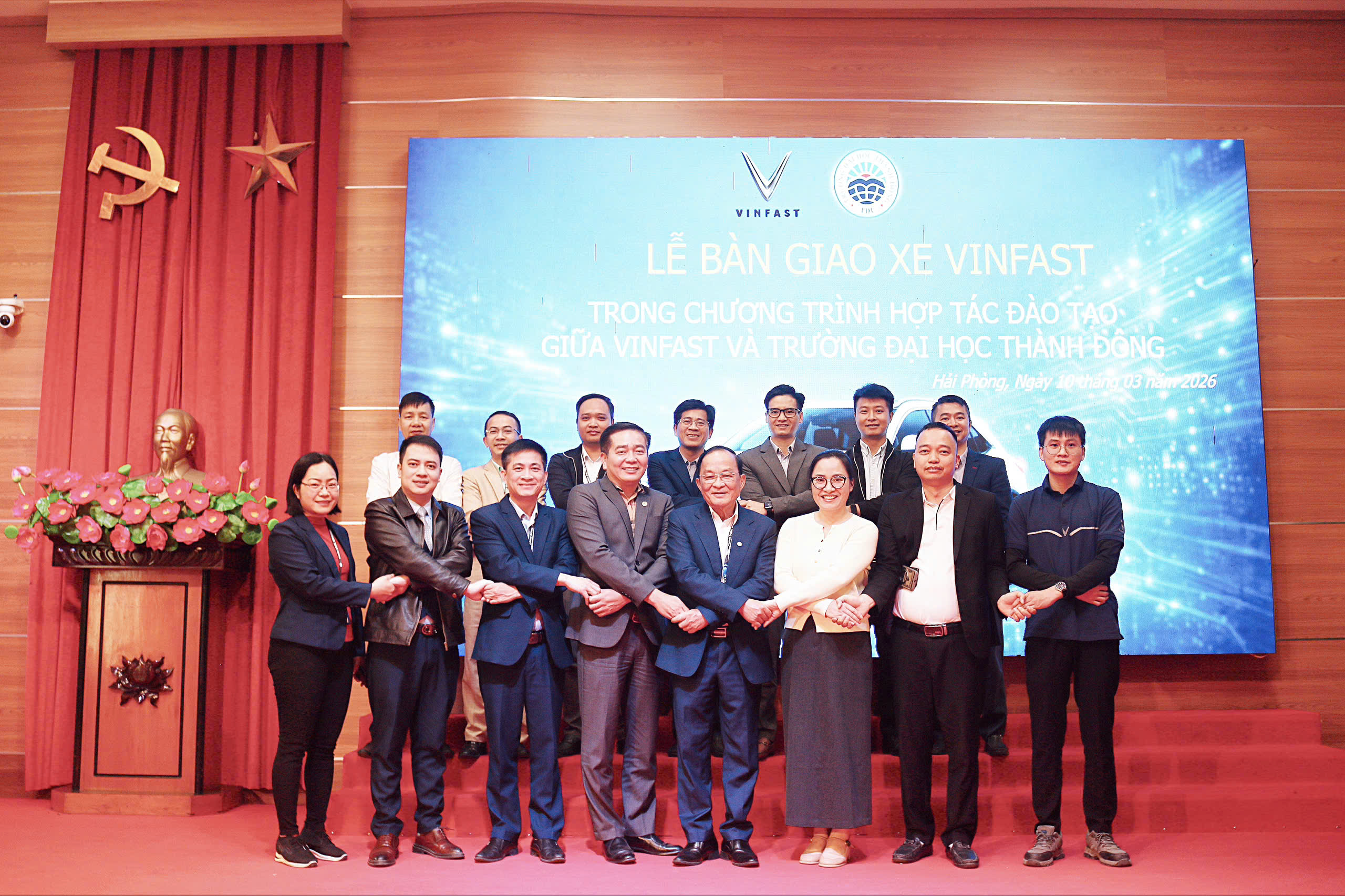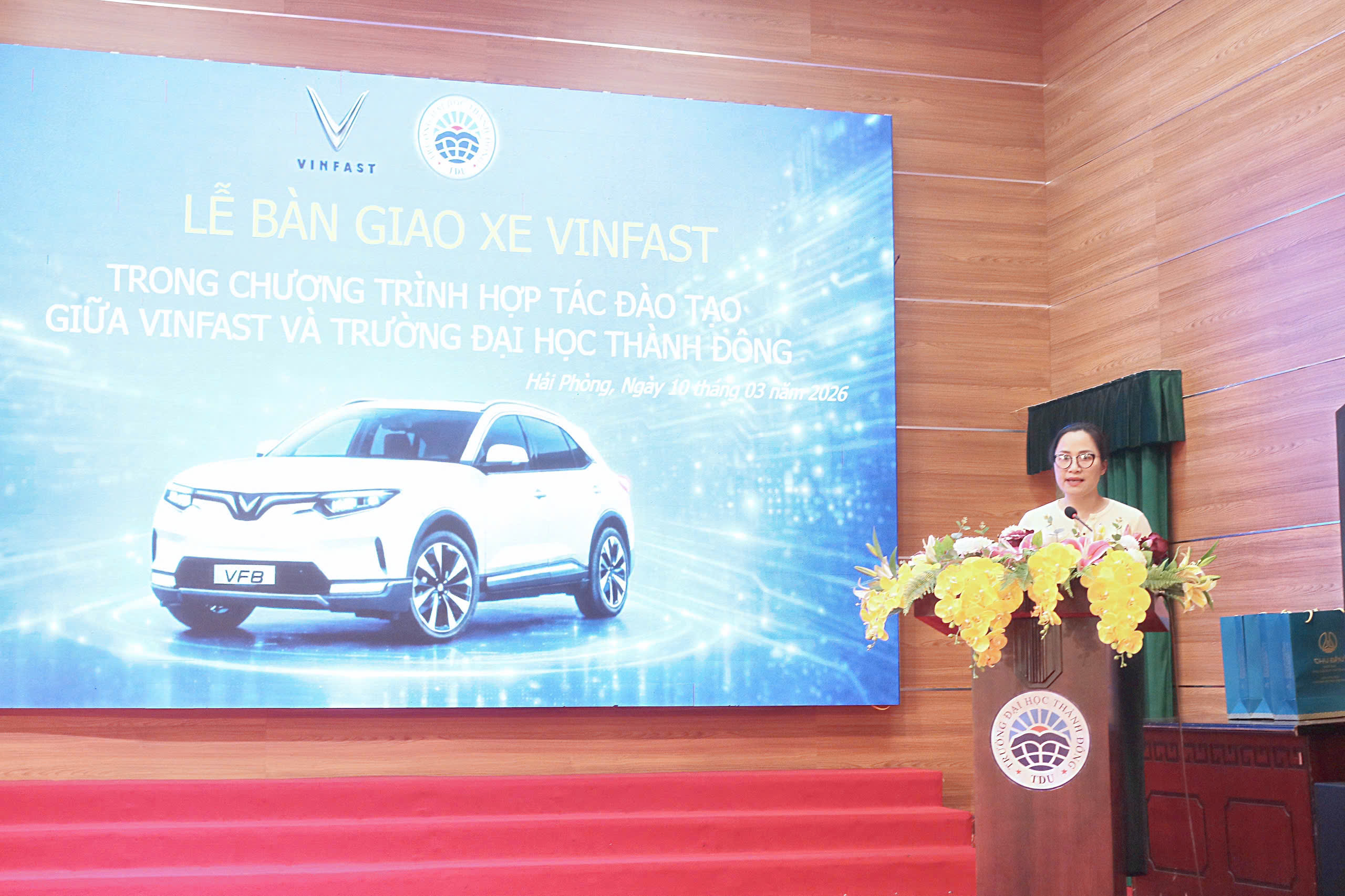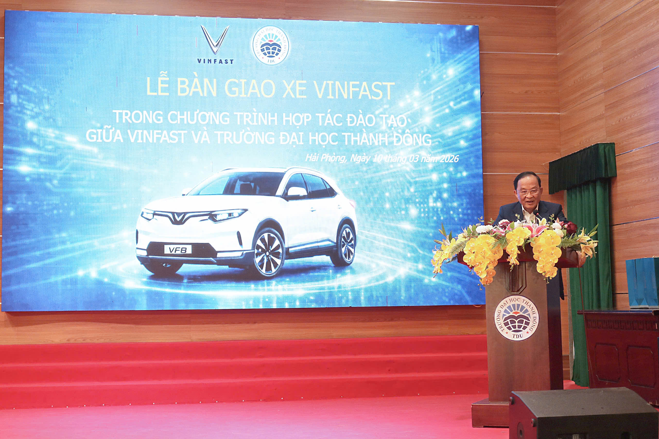 Lễ bàn giao xe điện VinFast VF8 giữa Trường Đại học Thành Đông và Công ty TNHH Sản xuất và Kinh doanh VinFast tại Hội trường A sáng 10/3/2026.